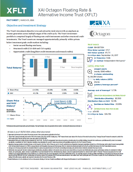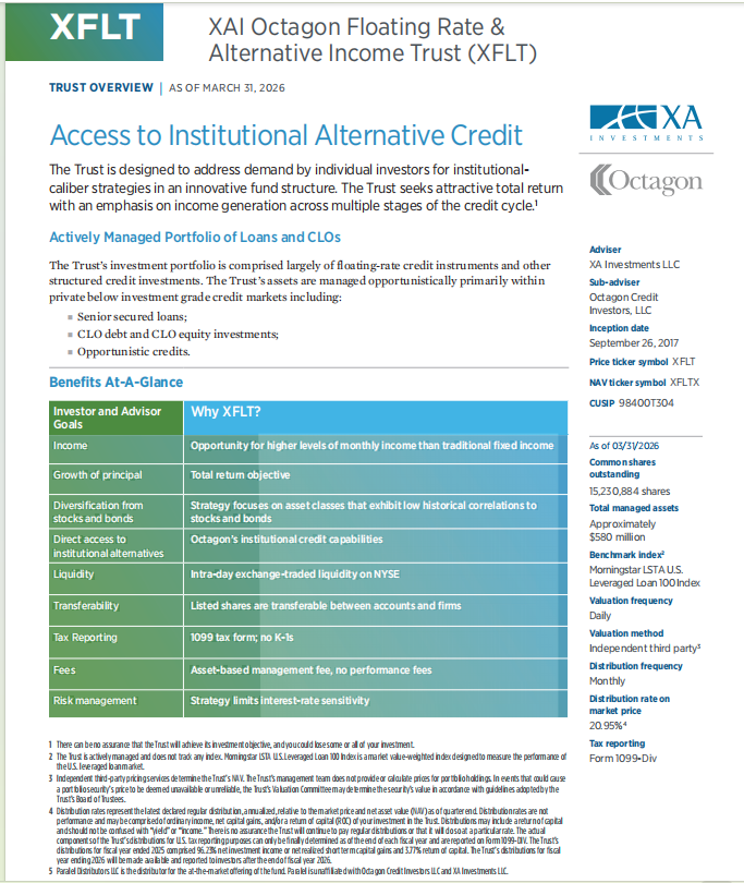 XAI Octagon Floating Rate & Alternative Income Term Trust (XFLT) is designed to address demand by individual investors for institutional-caliber strategies in an innovative fund structure. The Trust seeks attractive total return with an emphasis on income generation across multiple stages of the credit cycle.