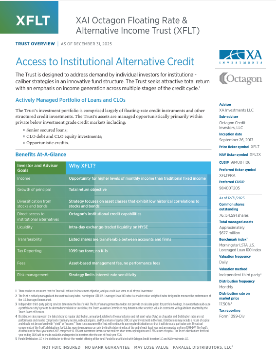 XAI Octagon Floating Rate & Alternative Income Term Trust (XFLT) is designed to address demand by individual investors for institutional-caliber strategies in an innovative fund structure. The Trust seeks attractive total return with an emphasis on income generation across multiple stages of the credit cycle.